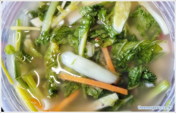 준비된 열무와 양념 mixture를 깨끗한 김치통에 담고, 물 2L를 부어줍니다. 이렇게 하면 물김치 형태로 완성됩니다.
